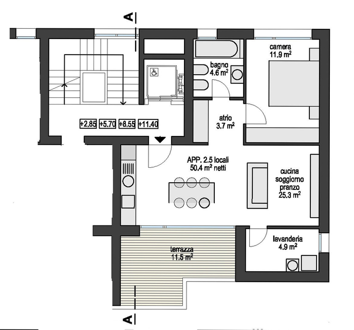 La residenza è composta da soli 8 appartamenti di 2 ½ locali, distribuiti due per piano e ripartiti tra il livello 1 ed il livello 4.