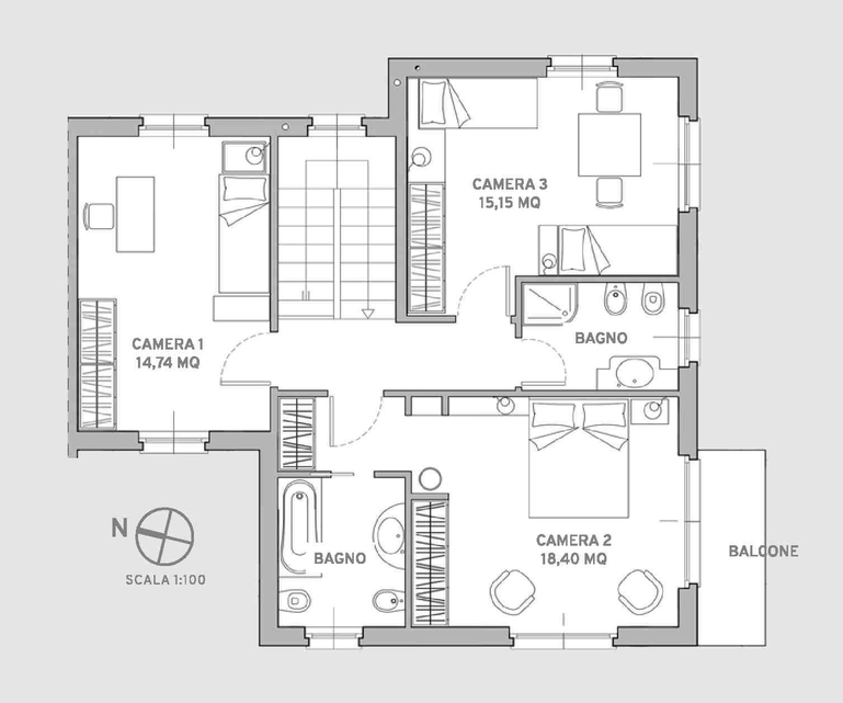 Il primo piano, adibito a zona notte, è composto da tre camere da letto di cui una con bagno padronale, un secondo servizio con doccia ed il balcone.