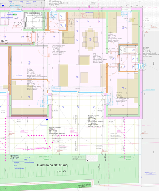 Divisori interni in mattoni di cotto e/o cartongesso. Particolare attenzione è stata data agli aspetti energetici: Impianto a regolazione individuale per ogni locale, termopompa e distribuzione calore con serpentine a bassa temperatura posate a pavimento e pannelli solari posati sul tetto.