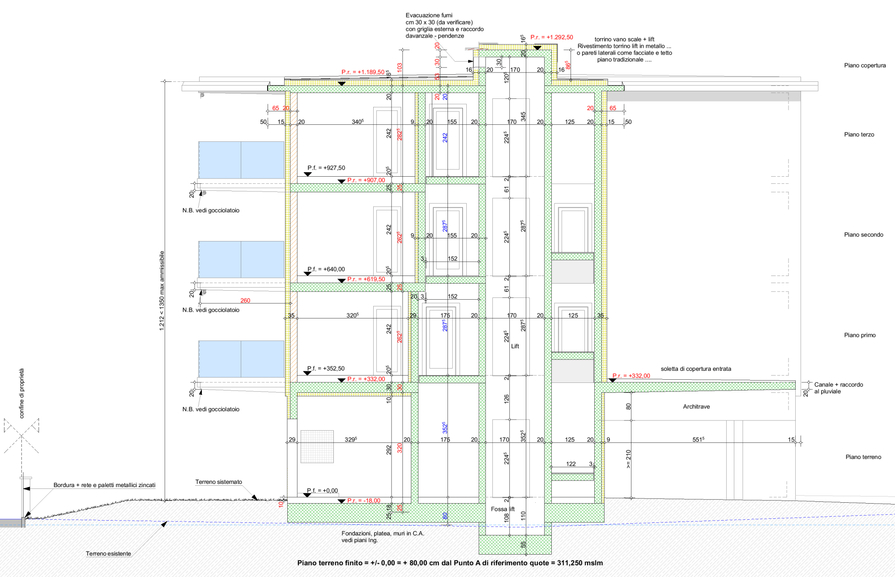 Struttura dell’edificio di tipo “massiccia” con elementi edilizi in cotto e cemento armato, muri perimetrali isolati con cappotto, solette in CA, serramenti con triplo vetro isolante.