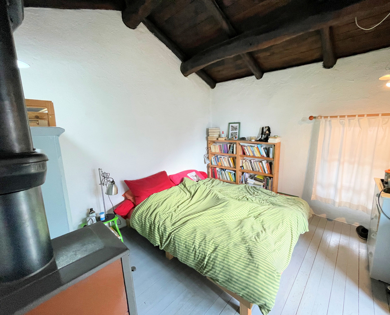 Il primo piano superiore, accessibile sia dall’esterno che dalla scala interna, offre una spaziosa camera da letto valorizzata dal camino e dal tetto con travi in legno a vista, e la seconda camera da letto.