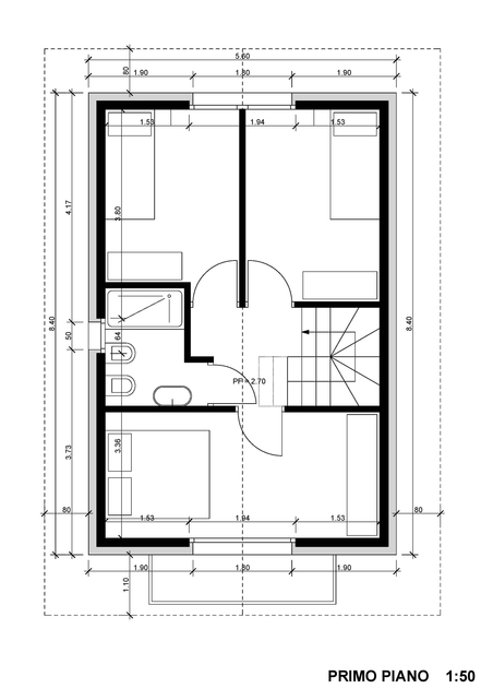 La zona notte si offre con il disimpegno che conduce alla camera padronale ed alle altre due camere singole, doppi servizi entrambi finestrati con vasca da bagno e con cabina doccia ed allacciamento per la colonna lava asciuga.