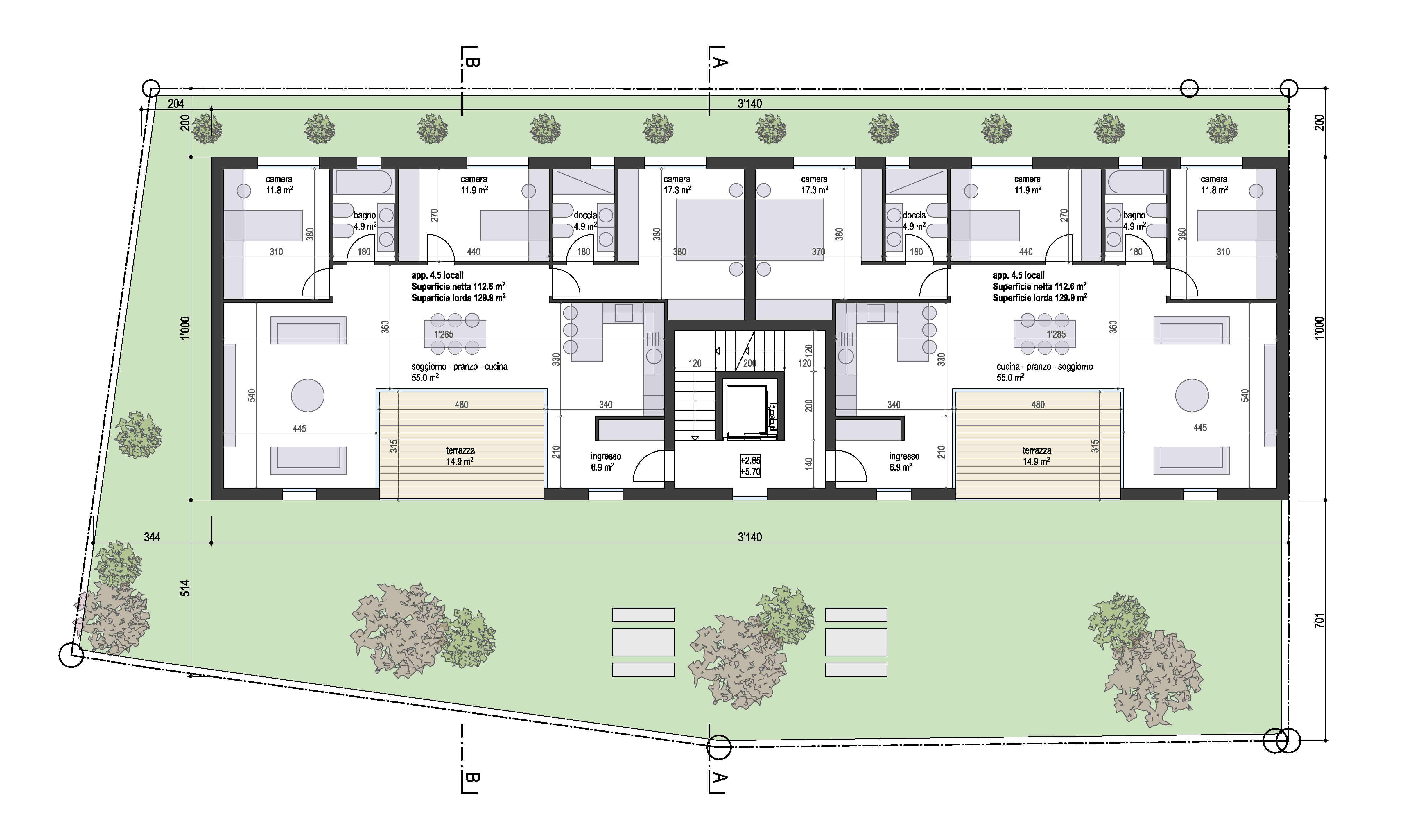 Al livello inferiore, piano terreno, si trovano i posti auto ed i giardini privati.