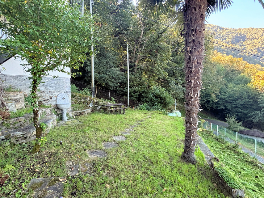 Il giardino con simpatica fontana e tavolo in pietra, si trova a vale della casa e gode del soleggiamento fino al tramonto.