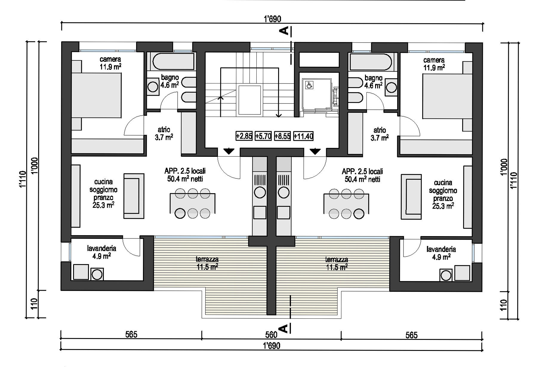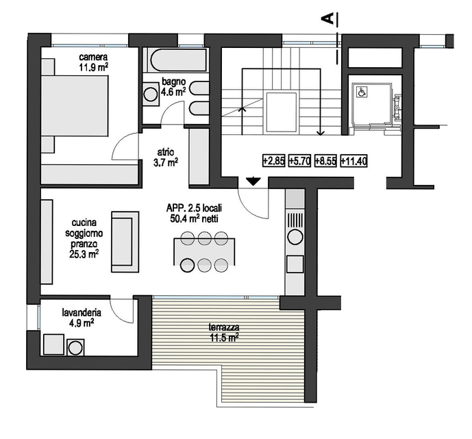 La residenza è composta da soli 8 appartamenti di 2 ½ locali, distribuiti due per piano e ripartiti tra il livello 1 ed il livello 4.