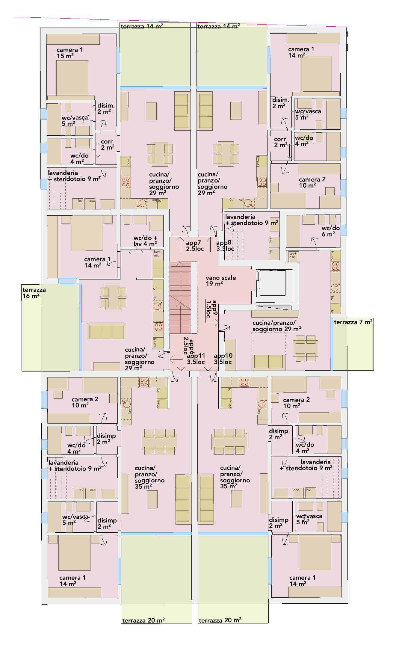 L’edificazione prevede la realizzazione di due stabili indipendenti di 3 piani su due livelli differenti che distribuiscono le abitazioni tra il piano terreno ed il secondo piano.