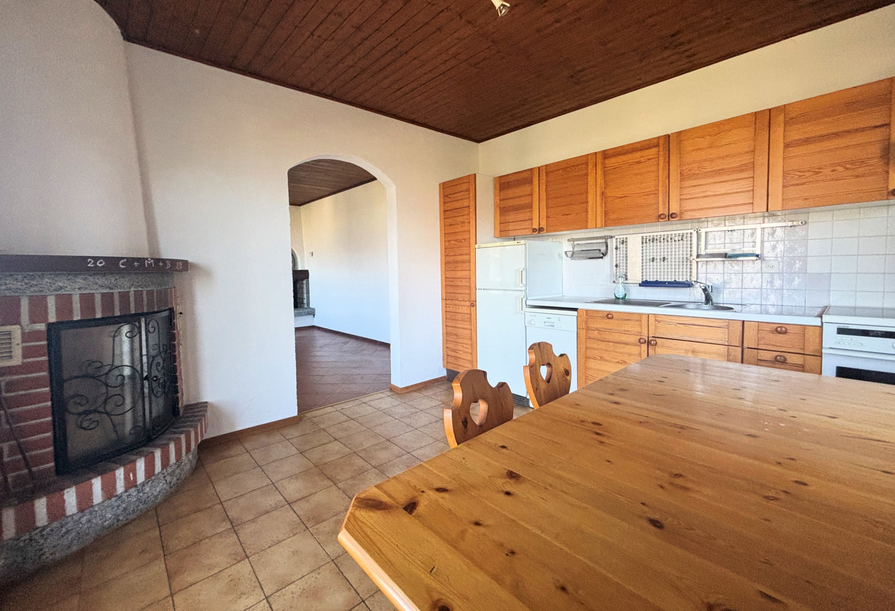 L’abitazione è così composta: Al piano superiore si trova l’originale cucina in legno massello, la zona pranzo con tavolo e panca coordinati ed il camino a legna.